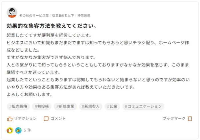 経営コンサルタントなども参加しているため、コメントをきっかけに専門家の支援を相談できる場合も。経営者特有の悩みをひとりで抱えず、解決しながら経営を進めていくことが可能です。