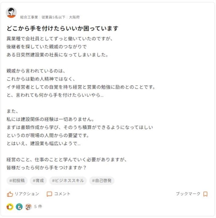 こちらの投稿者は、事業承継により突然経営者になったようです。そのため、経営知識をつけたいと思っているもの、そもそも何から手を付ければわからず、キャッチアップすべきかが見えていないことが悩みの種となっています。