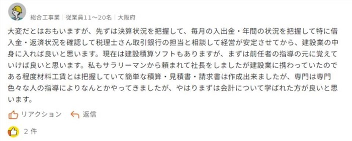 そのつぎに建設業の専門知識を培っていくのがおすすめとのこと。悩みにも書かれている「建設積算」については専用ソフトを操作しつつも、前任者の指導を受けながら覚えていくのが近道としています。このように、具体的な解決に向けたプロセスについて回答で投稿してくれる例も少なくありません。