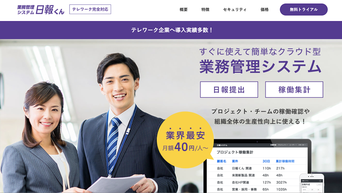 日報くんは日次・週次・月次などで個人の成果を集計・把握できる日報アプリ。PCやスマートフォンからどこからでも簡単に使え、最小限の手間で日報提出ができる便利な機能がたくさん用意されています。