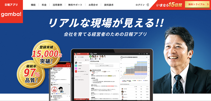 gamba!は、社内SNSの仕組みを取り入れた日報アプリ。15,000社を超える登録実績のある人気のサービスです。