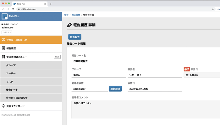 FieldPlusは、スマホやPCを通してリアルタイムで業務報告を行える日報アプリ。報告者ユーザーは業務報告を、管理者ユーザーはユーザーへのお知らせを送ることができます。