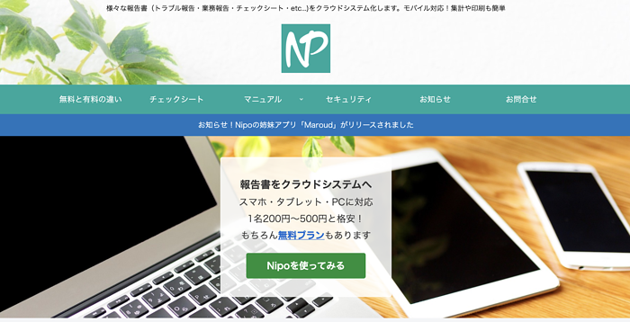 Nipoはテンプレートに入力していくだけの、シンプルでわかりやすい日報アプリ。複雑な機能はついておらず、PCでもスマートフォンアプリでも簡単に利用することができます。