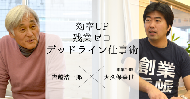 そこで今回は、「まずは「区切る」から始めなさい! 吉越式「勝ち抜け人生」のためのシンプル思考術」の著者であり、創業手帳の役員でもある吉越浩一郎氏と、創業手帳代表の大久保が「働き方」をテーマに徹底討論。残業ゼロでも生産性が上がる仕事術について、お話を伺いました。