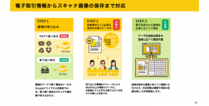 横井:「invox電子帳簿保存」のサービスの特徴をお話しさせて頂くと、大きく分けて3つのステップで、電子帳簿保存法への対応が行えます。