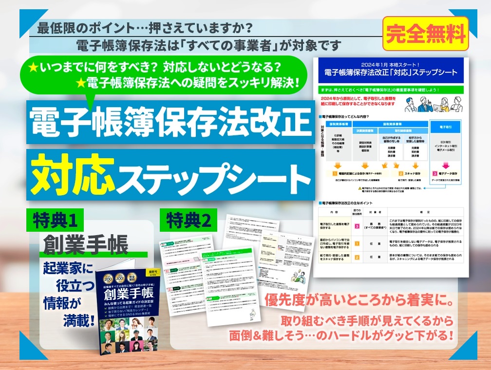 創業手帳では、上記のアンケート結果からもわかるように、電子帳簿保存法改正についてどのような事を対応したらよいかわからないという事業者の方に、対応していくべきことを優先順位付けし、いつまでに何を対応すべきなのかをわかりやすく解説した「電子帳簿保存法改正 対応ステップシート」を無料でお配りしています。