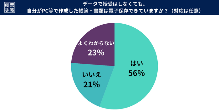一方で、まだ義務化にはなっていない「自身がPCなどで作成した帳簿や書類の電子保存」について、どのくらいの割合で対応がされているのかを聞いてみたところ、56%が「既に対応している」という回答に。「いいえ」と答えた回答は20%程度となりました。