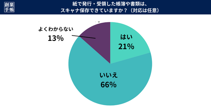 一番ハードルが高い「紙で発行・受領した帳簿や書類についてのスキャナ保存」については、「実施している」という回答が21%になっています。