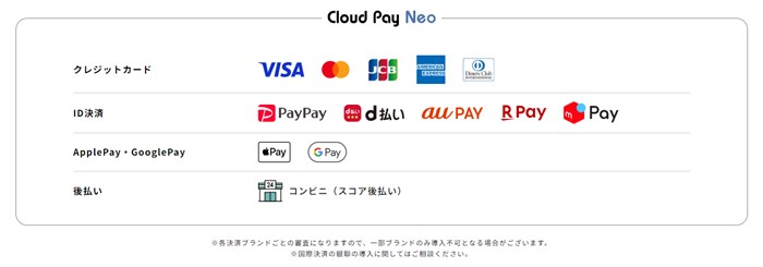 クラウドペイネオは、顧客がQRコードを読み取った後に、任意の決済手段を選択できます。2024年9月現在、以下のような決済手段に対応しています。