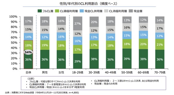年代別のキャッシュレス決済割合でも日常生活において「7~8割程度以上キャッシュレスを利用する」と回答した人が全体の54%となり、一般消費者の中にキャッシュレス決済が広く浸透していることが分かります。
