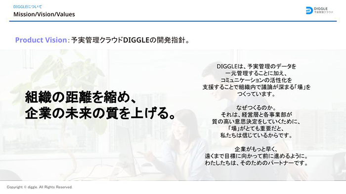 同社は「組織の距離を縮め、企業の未来の質を上げる。」をプロダクトビジョンに掲げ、企業の予実管理を行うSaaS型の経営管理プラットフォーム「DIGGLE」を提供しています。