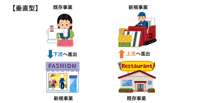 垂直型は、製品やサービスに関わる上流や下流に向かって事業を拡大していく形です。例えば、「飲食チェーンを展開する企業が、食材を生産する事業に乗り出す」、「繊維工場がアパレルブランドを立ち上げる」といったケースをイメージするとわかりやすいでしょう。既存の事業にない新たなノウハウなどが必要になる場合が多い一方で、新規事業を軌道に乗せることができれば、既存事業のさらなる強化を図ることができます。
