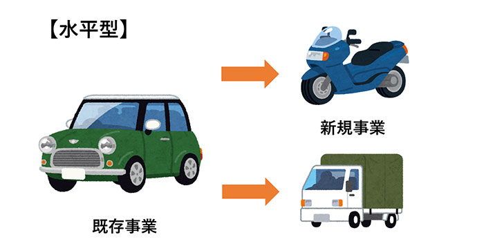 水平型は、既存の事業や技術を活用し、同じ分野の市場に対して新製品やサービスを生み出していく形です。例えば、「家庭向けの自動車を主力商品として作っていたメーカーが、バイクやトラックも生産する」ことなどが挙げられます。既存の生産技術や流通を利用することで、新規事業に乗り出すコストを抑えたり、既存事業とのシナジー効果を高めたりしやすくなります。