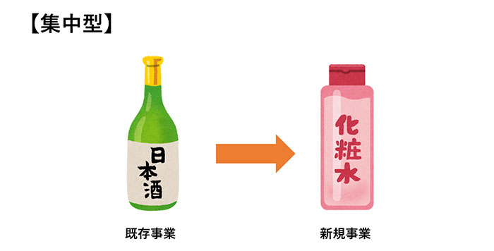集中型は、既存の事業で培った技術やノウハウを活用して、新しい領域のプロダクトやサービスを生み出す形です。例えば、「酒造メーカーが、お酒の成分を含む化粧品を販売する」「楽器メーカーが、楽器製造の技術を応用した消毒用アルコールスタンドを作る」といったケースが挙げられます。既存の経営資源を活用して、新たな成長分野に進出する場合などに活用できる多角化戦略です