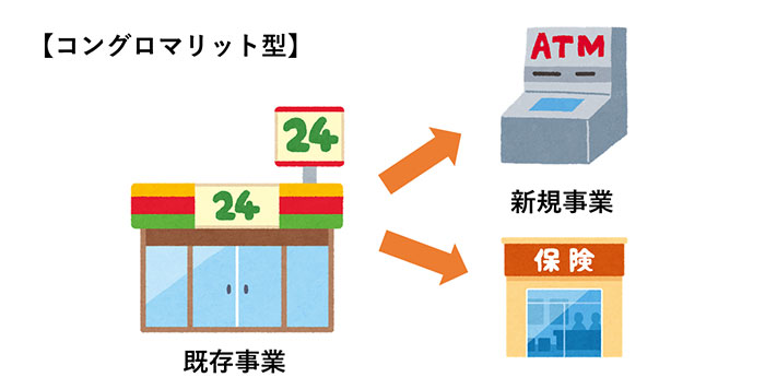 コングロマリット型は、既存事業と全く関連のない、新しい領域に事業を展開する形です。例えば、コンビニ大手がATMなどの金融サービスを始めたり、自動車メーカーがリゾート事業に進出したりすることが挙げられます。まったく新しい分野へ事業を展開することになるため、最もハイリスクな多角化の形と言えるでしょう。M&Aによって、事業を買収する形をとることも多いです。