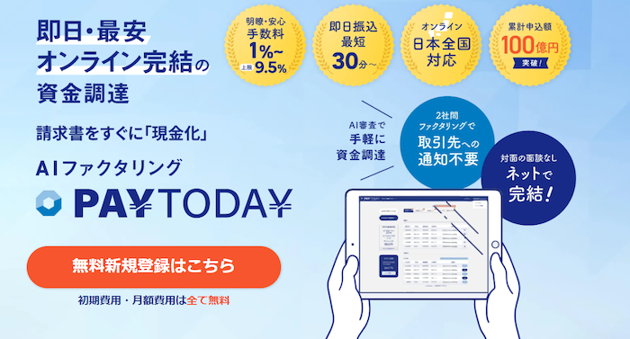 弊社PAYTODAYはファクタリングにAIによる審査を導入したAIファクタリングサービスを展開しています。