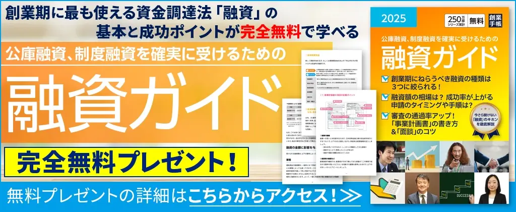 創業手帳オリジナル「融資ガイド」では、創業期に使いやすい融資を徹底解説!申請手順やタイミング、審査通過のポイントまで掲載しています。