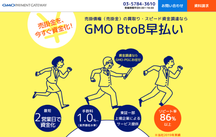 GMO BtoB早払い GMO PAYMENTGATEWAYは手数料が業界最低水準の1.0%~。コストを抑えて現金化したい企業には特におすすめです。リピート率が86%と高いことからも、利用者の同社ファクタリングに対する満足度の高さがうかがえます。