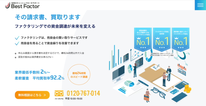 ベストファクターは日本トレンドリサーチの2020年5月に実施したイメージ調査で「経営者に紹介したファクタリング会社No1」に選ばれるなど、高い評価を得ています。