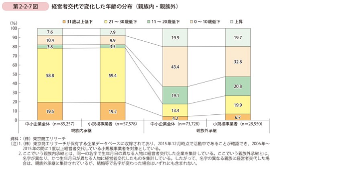 家族経営の場合、事業主の仕事を家族に補佐してもらうことで、自然に後任者を育成することになります。しかも、早期に始められることから、長期間にわたる教育を行うことができます。候補となる人材が家族内にいるので、経営陣の交代も円滑に進みます。しかも、事業承継時には大幅な若返りが実現します。それを示すのが「2017年版 小規模企業白書」の第2-2-7図です。