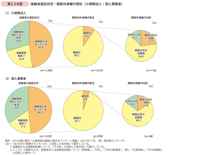 上記のグラフでは、小規模事業者 (小規模法人および個人事業者) が事業の承継をどのように考えているかを示しています。アンケートによれば、後継者が決まっている会社のうち小規模法人の90%以上個人事業者の実に95%以上が、親族内に後継者がいると回答しています。