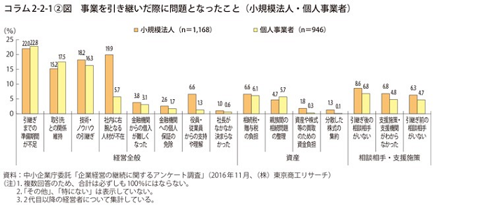 家族の各人がどのような役割を担うか、明確にしましょう。そうすれば、仮に家族内で対立が起きたとしても、経営に及ぼす影響を最小限にとどめることができます。役割分担の大切さは、事業承継で何が問題になるかを調査した「2017年版 小規模企業白書」のコラム2-2-1②図からも分かります。