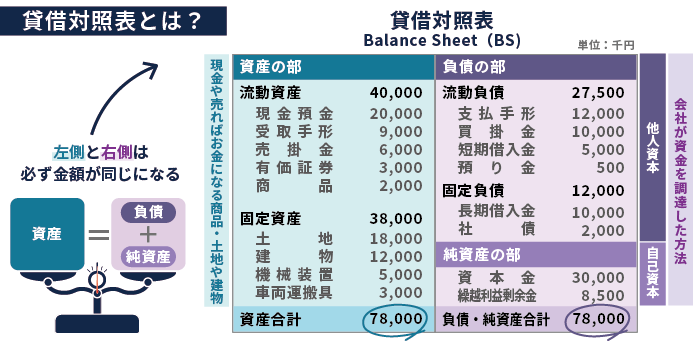 決算時の残高を可視化して、財務状況を把握するものです。資産の合計と負債純資産の合計は同じ金額で均衡な状態を保つため、バランスシートと呼ばれています。
