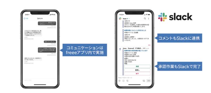 経理業務では、上がってきた請求書や経費申請の正当性・正確性の確認に一定の手間がかかりますが、freeeではこうしたコミュニケーションもWeb上で完結。同社ではSlackとの連携機能を使って、Slack上で承認や確認などのコミュニケーションを行っています。