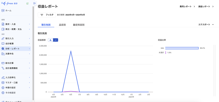 銀行口座から入った情報や、直接打ち込んだ情報を仕訳するだけで、日々の帳簿をつける事ができる。月末には、以下のような収益レポートが作成されている。