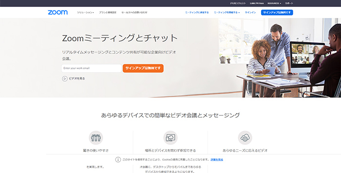 Zoomはビデオ通話や会議が簡単にできるサービスです。ビデオに参加できる人数は無料版で100名。オプションの購入で最大1,000名が参加可能、10,000名まで閲覧可能となっています。打ち合わせに活用できるだけでなく、オンラインでセミナーを開催することもできます。