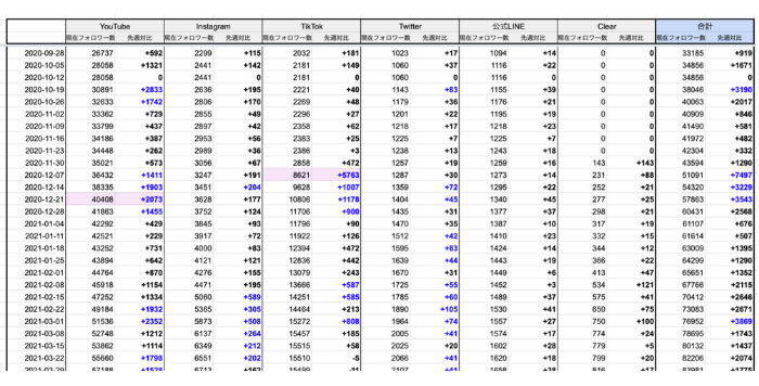 - フォロワー数→毎週記録