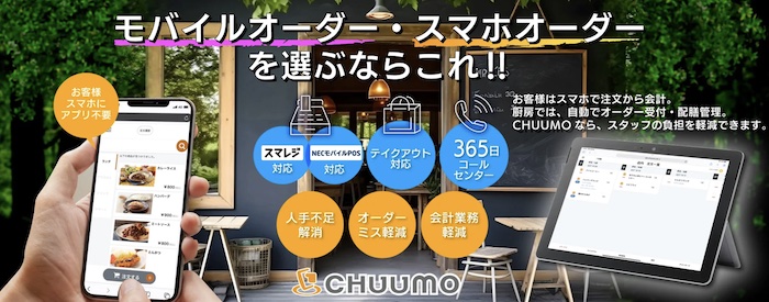 人手不足解消や業務効率化、オーダーミス削減などのために、飲食店にモバイルオーダー・スマホオーダーを導入するなら、飲食店向けモバイルオーダーシステム「CHUUMO」がおすすめです。