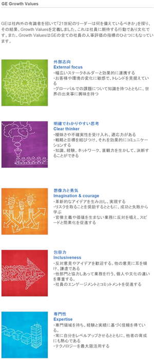 5番目が「Expertise」、つまり専門性で、専門知識とテクノロジーをどれだけ使えるかということです。この5つのグロースバリューについてはかなり細かく文章にして全社員に配っているので、社員は自分が一体どういう行動を取るべきなのかということが分かります。実はこの5つのグロースバリューは全世界共通で、GEではどこにいっても同じやり方で評価されます。