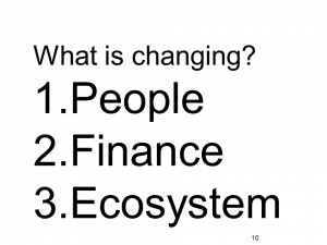 他国に比べ保守的で言われる、起業に後ろ向きといわれる日本だが、変化が起こりつつある。人、お金、エコシステムの3つの変化がある。