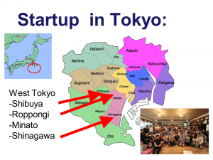 東京のスタートアップのエリアを解説。渋谷、六本木などを紹介。個人的には五反田(オイシックス、freeeなどが立地)に注目だがドイツ人にはマニアックなので割愛。