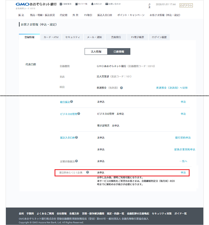 振込料金とくとく会員の申し込みは、法人口座開設後のログイン後画面で申込できます。申し込みが済んでいない場合、「未申込」と記載されているため、右側にある「申込」をクリックするだけで手続きを行えます。