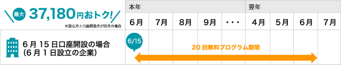 設立1年未満のお客さまは、登記上の設立月から12カ月間、他行宛て振込手数料が毎月20回無料となる優遇サービスがあります。