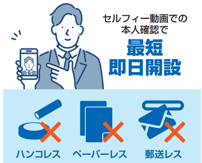 口座開設の手続きは全てネットで完結。特にセルフィー動画を活用した開設手続きであれば最短即日※から口座を利用できるようになります。