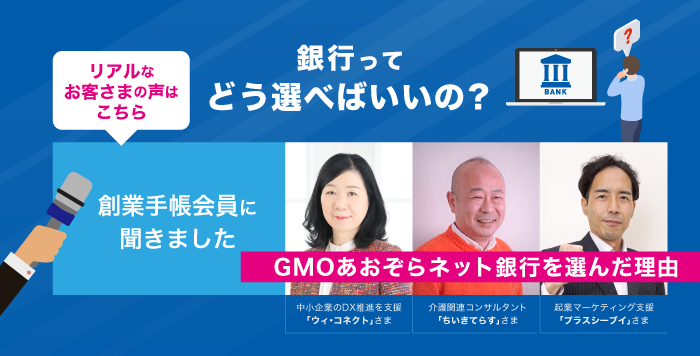 今回は、GMOあおぞらネット銀行を利用している創業手帳会員に取材しましたので、同行を利用するメリットや注意点について紹介していきます。