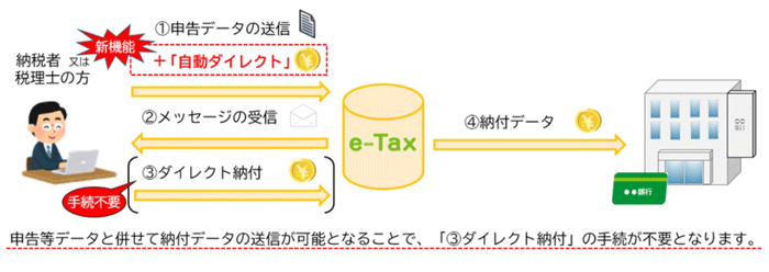ダイレクト納付とは、e-Tax(国税電子申告・納税システム)を利用して申告書を提出した後、税金を支払う期日を決めて口座引落により納税する手続きをいいます。