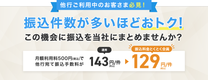 GMOあおぞらネット銀行の口座宛てであれば無料、他行宛てでも143円/件です。振込料金とくとく会員(月額利用料:500円)になれば、他行宛て振込手数料が129円/件となります。