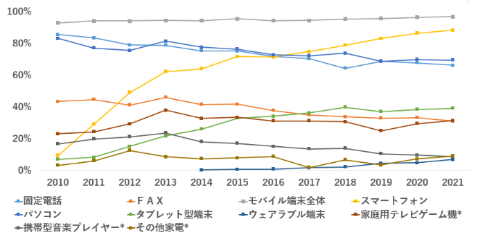 総務省の情報通信白書では様々な通信デバイスの普及率を定期的に調査し公表していますが、2017年にスマホの普及率がPCを抜いて、情報通信端末の中でトップとなりました。その後も普及率は緩やかに上昇傾向です。スマートフォンは、ほとんどの日本国民にとって身近な通信端末となりました。
