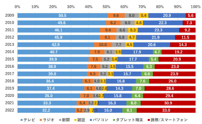 出所:日経XTECH「スマホ/携帯電話の接触時間がテレビ超え、博報堂DYMPのメディア定点調査から」