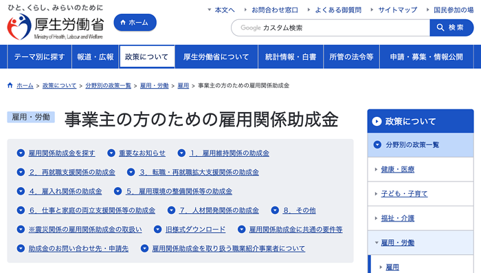 「雇用関係助成金」は、厚生労働省が扱う雇用に関わる支援金の総称で、「雇入れ関係の助成金」「雇用維持関係の助成金」など8つの分野に分かれています。