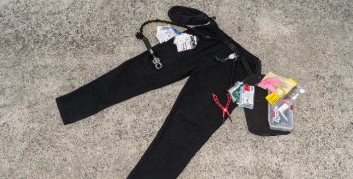 岸原:釣りでは色々な道具を使うため、できるだけ多くの道具を入れられる方が便利です。そこで、ポケットが多い「ペインターパンツ」をベースに、普段使いもできるデザインを取り入れています。