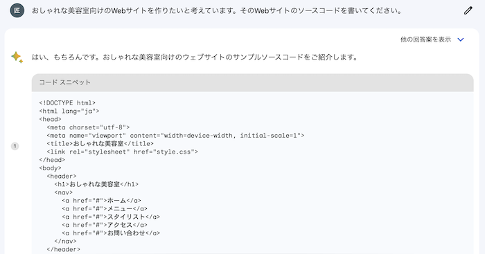 そこでGoogle Bardに「おしゃれな美容室向けのWebサイトを作りたいと考えています。そのWebサイトのソースコードを書いてください」とお願いしました。