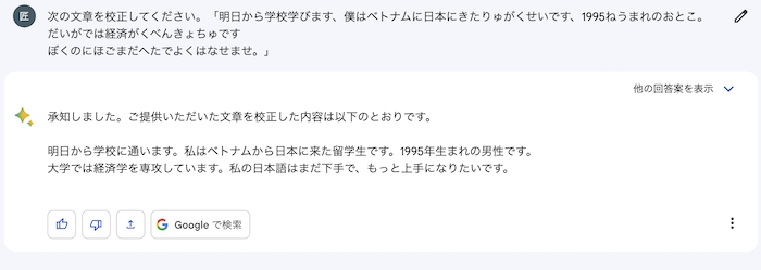 Google BardもChatGPTと同様に、文章の校正・校閲が得意です。時間がないときなどにパパッと確認する目的や、メールなどの文章の最終確認などで使うと良いでしょう。