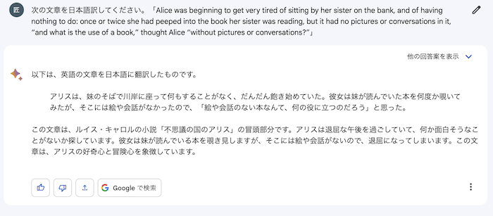 試しに、『不思議の国のアリス』の冒頭の文章について、翻訳してもらいました。すると、以下のような返事が生成されました。
