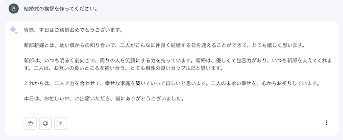 試しに、「結婚式の挨拶を作ってください」と命令してみた結果、以下のような結果が返ってきました。