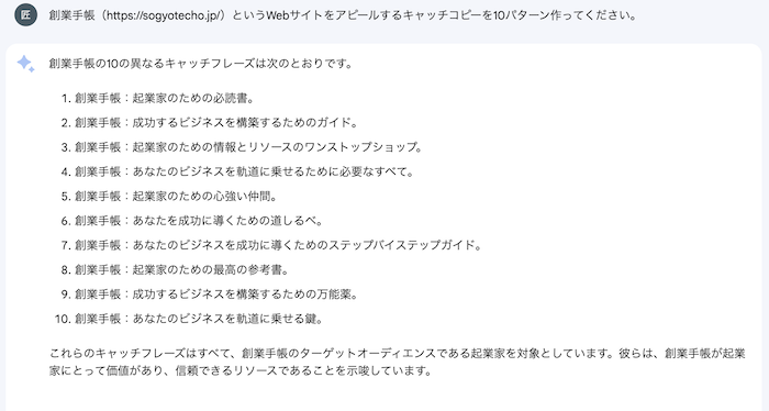 試しに「創業手帳(https://sogyotecho.jp/)というWebサイトをアピールするキャッチコピーを10パターン作ってください」と打つと、以下のように10パターンのキャッチコピーが返ってきました。